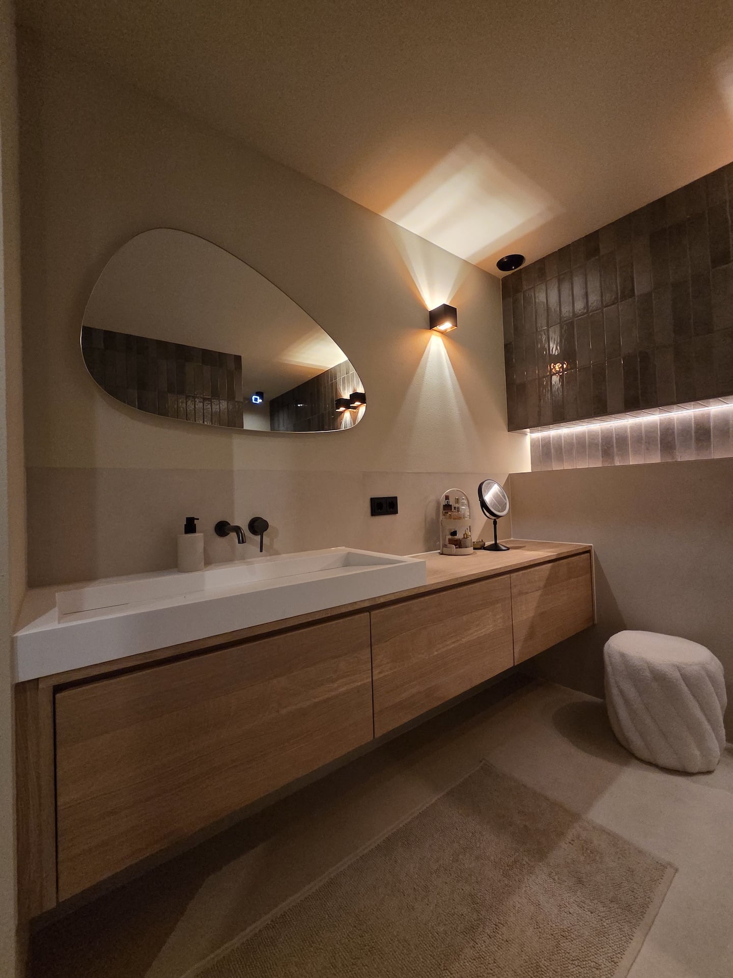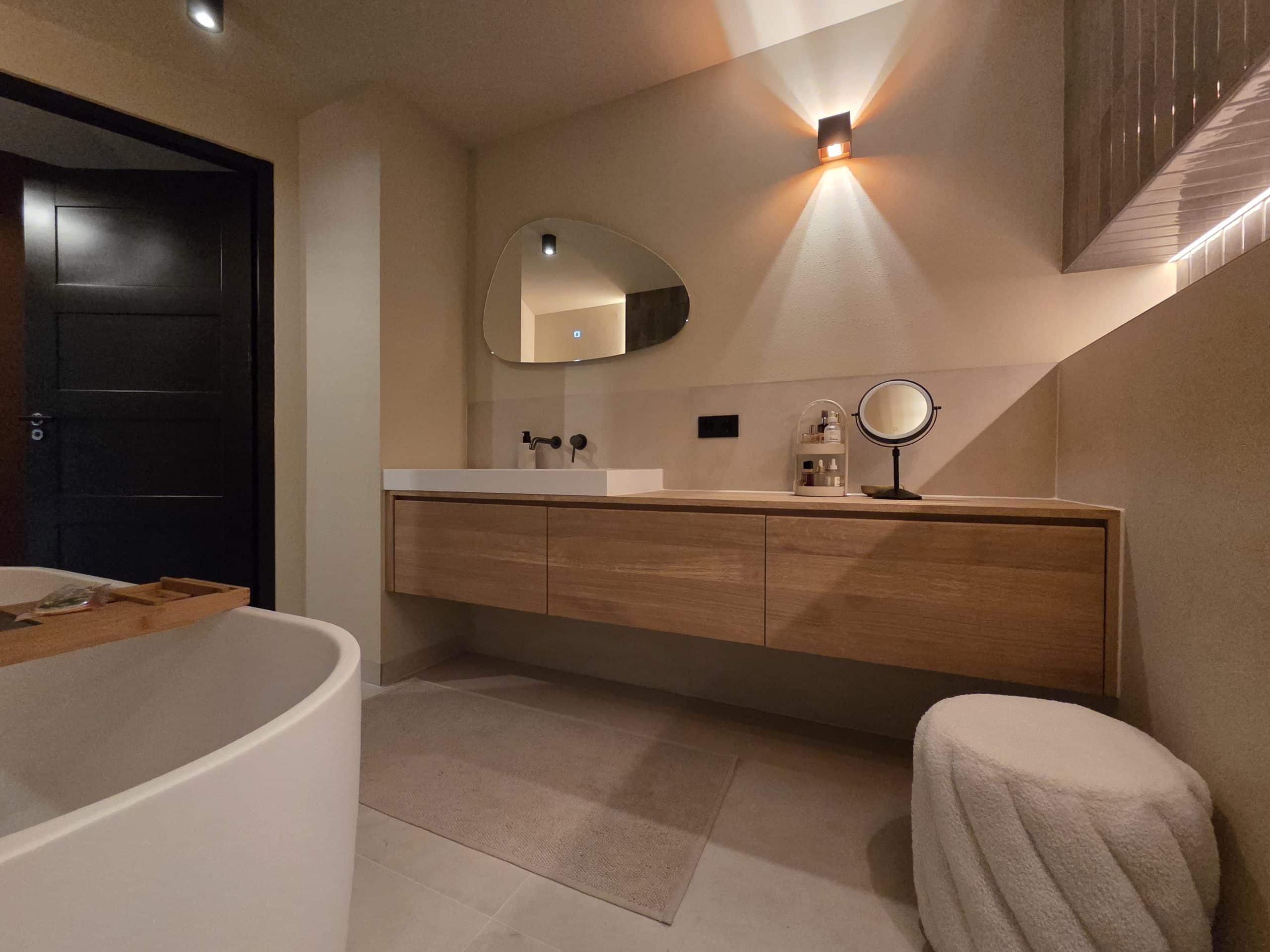 De lades van badmeubel Ollie pas je gemakkelijk aan met ladegeleiders en handvatten of ‘push-open’ systemen. Ook is het mogelijk een sifon inkeping aan de lade toe te voegen, noesten op te laten vullen en een ronde, ovalen of natuurstenen waskom erbij te bestellen. Zo is jouw eiken badmeubel direct compleet. Voor de montage kun je er een haaklat bij bestellen. Een haaklat is een bevestigingslat waarmee je het meubel zwevend ophangt.