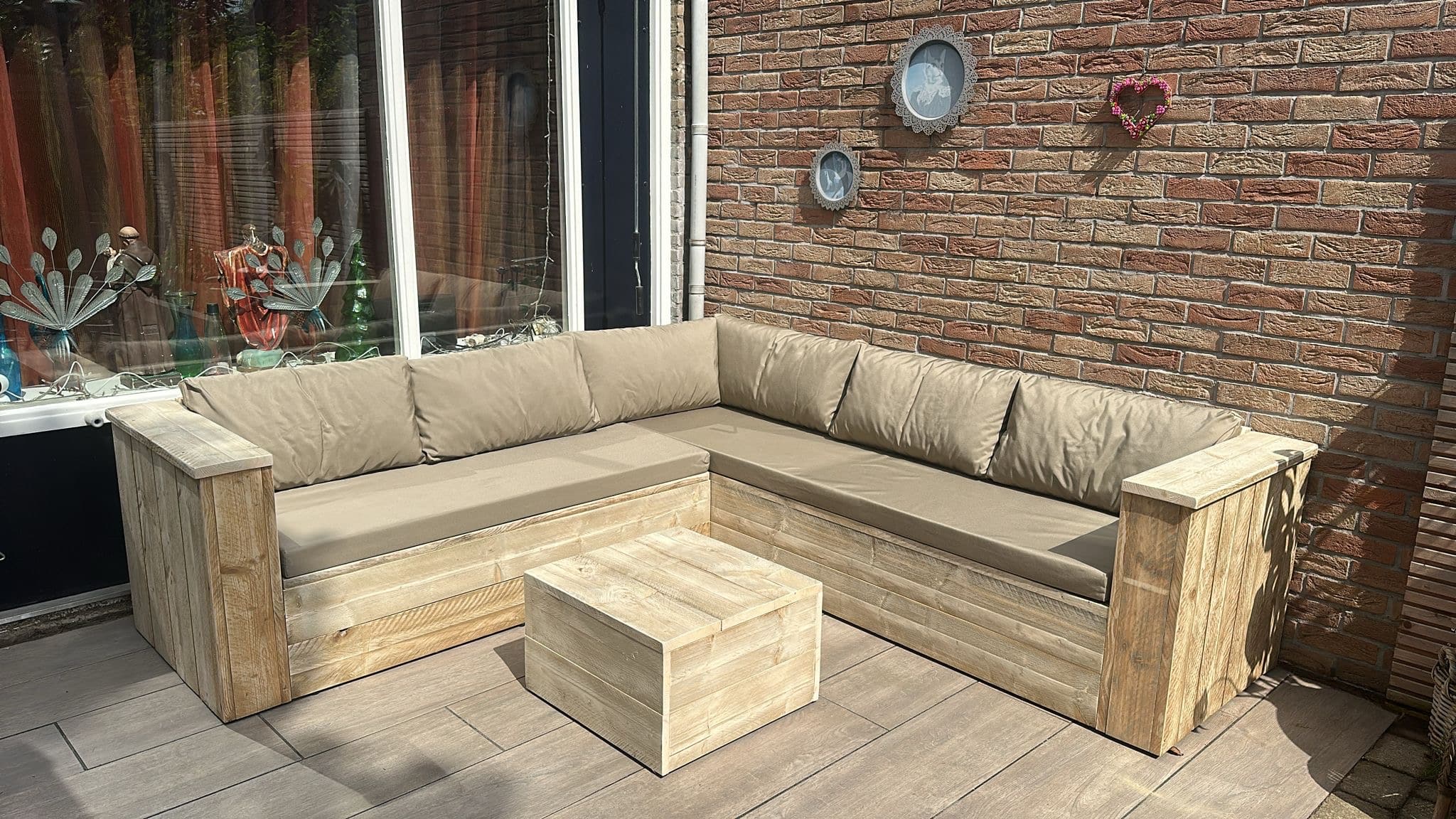 - Steigerhouten loungebank met blok armleuningen van 20 cm breed