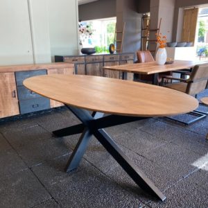 Mangohout ovalen tafel Aalden met verjongde rand en spinpoot