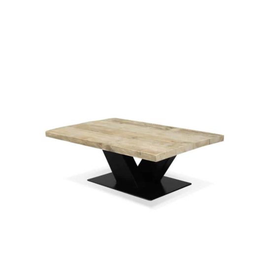 Industriële salontafel Corder heeft een stalen onderstel in de vorm van een V. Door de dikke steun waar de tafel op rust is het gevaar van kantelen geweken. Doordat het model open is aan de onderkant, creëer je optisch veel ruimte.